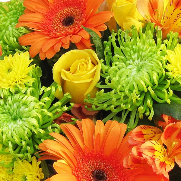 Стандартный: гербера оранжевая - 2 шт., роза желтая (60 см) - 3 шт., хризантема кустовая желтая - 2 шт., альстромерия оранжевая - 3шт., хризантема зеленая (шамрок) - 3 шт., декоративная зелень, фетр желтый.