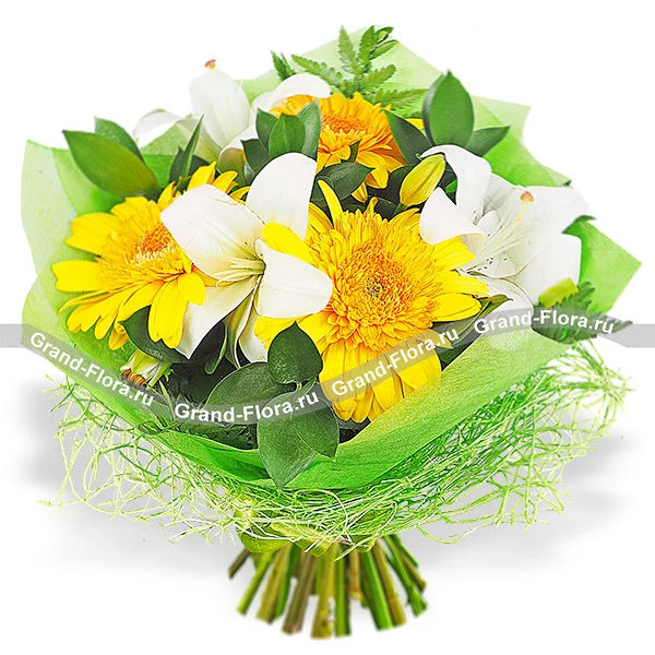 Прекрасная возможность преподнести ранним утром солнечный букет из гербер и благоухающих лилий. Сделайте день запоминающимся просто так - без повода! Или вручите букет в качестве извинения, который будет радовать получателя не меньше 7 дней*.