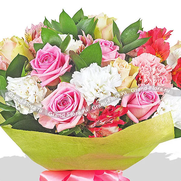 Стандартный (на фото): роза розовая - 5 шт., роза желтая - 4 шт., гвоздика розовая - 5 шт., гвоздика белая - 5 шт., альстромерия розовая - 1 шт., альстромерия красная - 2 шт.,