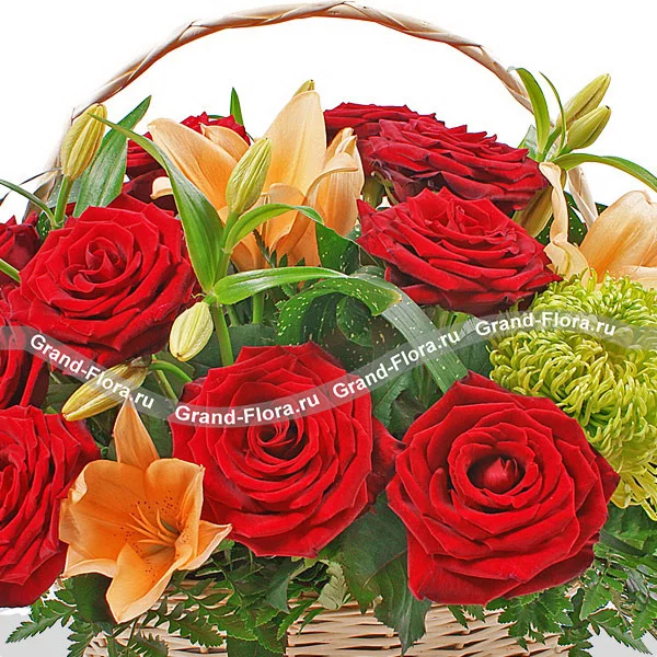ЛЮКС: роза красная (50 см) - 21 шт., лилия желтая (по сезону. возможна замена на белую) - 3 шт., хризантема одноголовая зеленая - 5 шт., салал, папаратник - 6 шт., оазис, корзина.