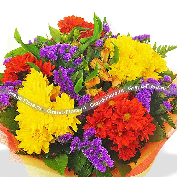 Стандартный: хризантема желтая кустовая - 2 шт., хризантема кустовая оранжевая - 2 шт., альстромерия оранжевая - 2 шт., статица - 4 шт., фетр желто - оранжевый, ваза.