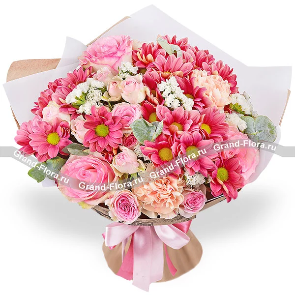 Стандартный: роза розовая - 2 шт., кустовая хризантема темно-розовая - 3 шт.,кустовая роза розовая - 2 шт., гвоздика персиковая - 2 шт., статица, эвкалипт, упаковка, лента. Примерный размер: 30Х30 см.