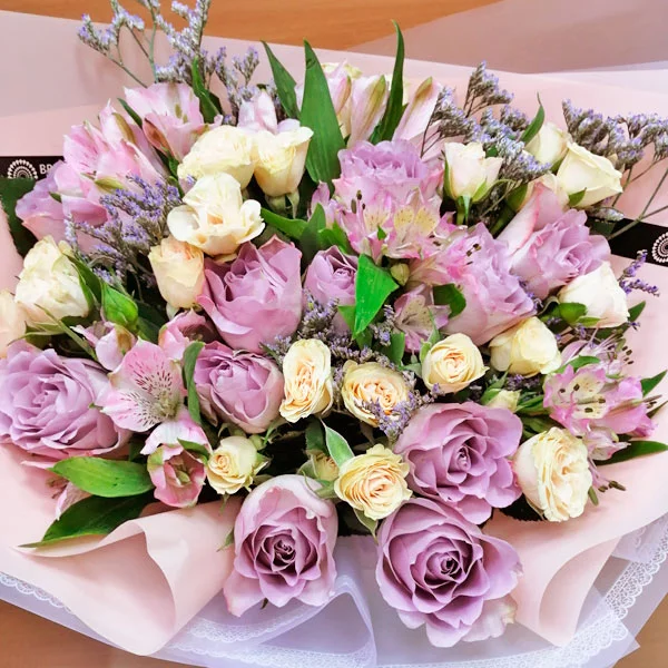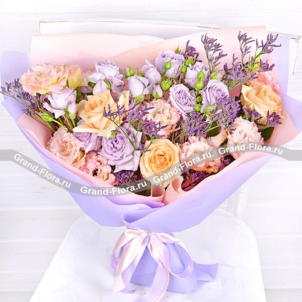 Чарующие и необыкновенные розы сиреневого и кремового оттенка, розовая эустома и фиолетовый лимониум в букете выглядят гармонично, роскошно и привлекательно.
